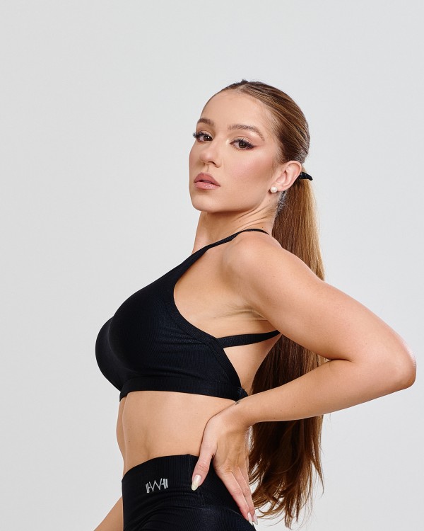 O Top Canelado Halter Neck, é confeccionado em tecido de poliamida zero transparência microcanelado, com um elegante efeito glossy acetinado. Este modelo apresenta uma frente única com um logo minimalista, bojo removível e gola fechada, além de costas abertas em design triangular, que trazem um toque moderno ao visual. O fechamento por colchetes metálicos proporciona um ajuste seguro e confortável.