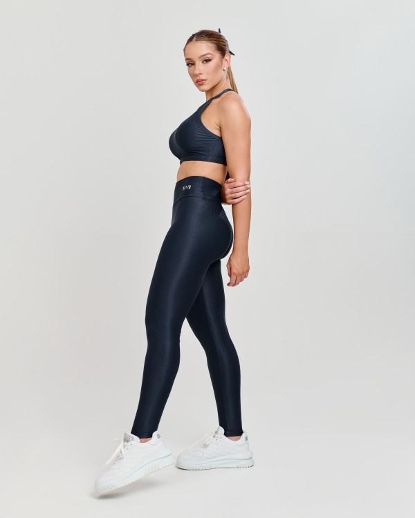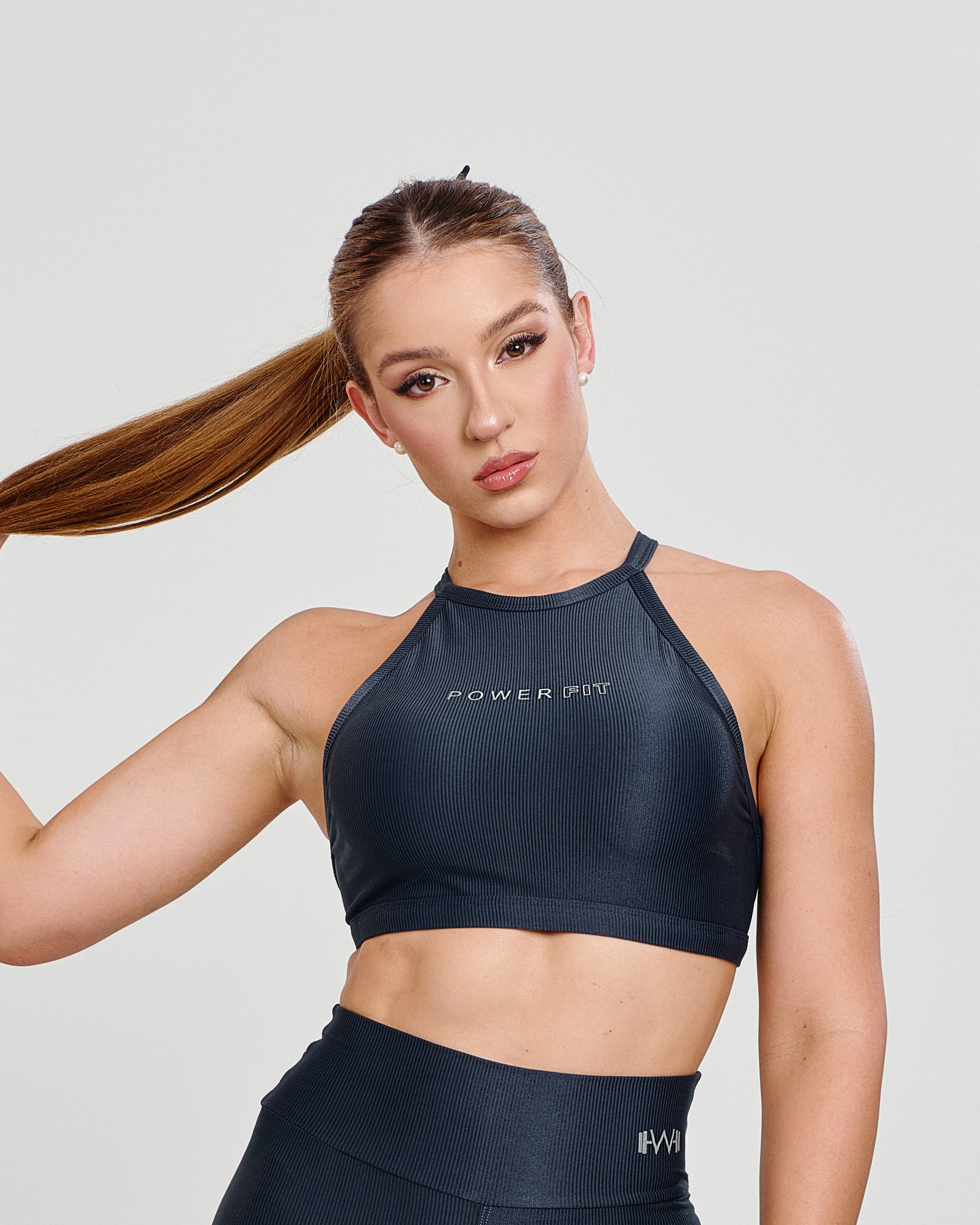 O Top Canelado Halter Neck, é confeccionado em tecido de poliamida zero transparência microcanelado, com um elegante efeito glossy acetinado. Este modelo apresenta uma frente única com um logo minimalista, bojo removível e gola fechada, além de costas abertas em design triangular, que trazem um toque moderno ao visual. O fechamento por colchetes metálicos proporciona um ajuste seguro e confortável.