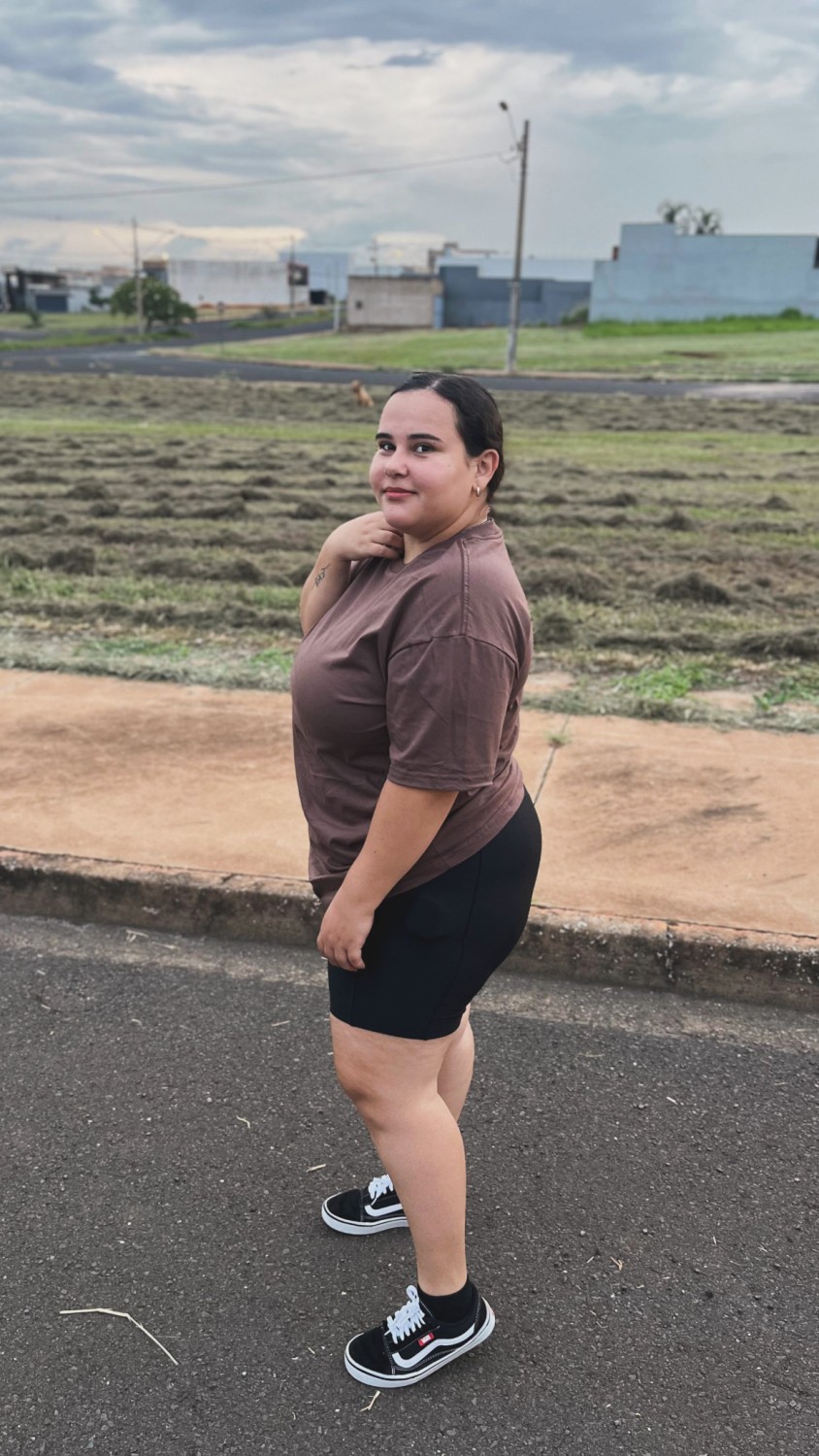 O modelo meia coxa apresenta bolsos laterais práticos, cintura alta e cós duplo, além de um recorte em V no bumbum que valoriza suas curvas de forma elegante, substituindo o empina bumbum tradicional. O logo minimalista completa o visual com um detalhe sutil e moderno.