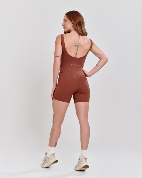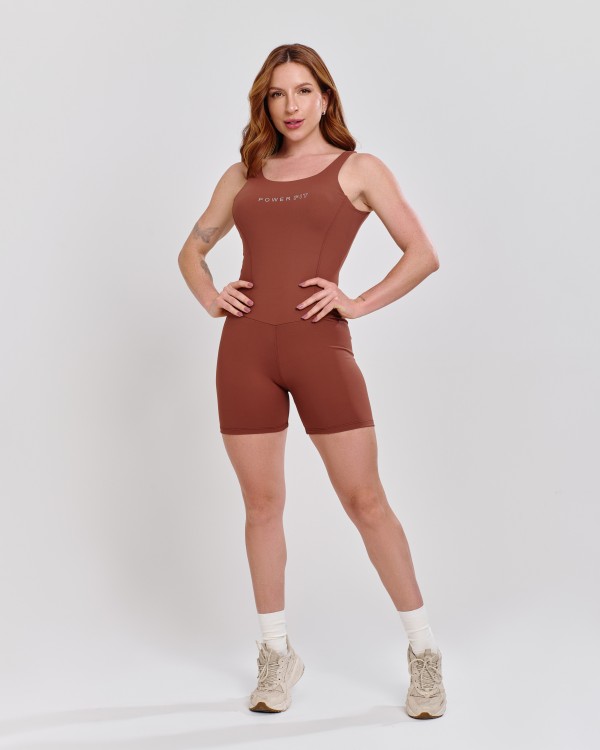 , valorizando suas curvas com elegância. O comprimento meia coxa e os logos minimalistas tornam este macacão uma escolha versátil, ideal para usar dentro e fora da academia.