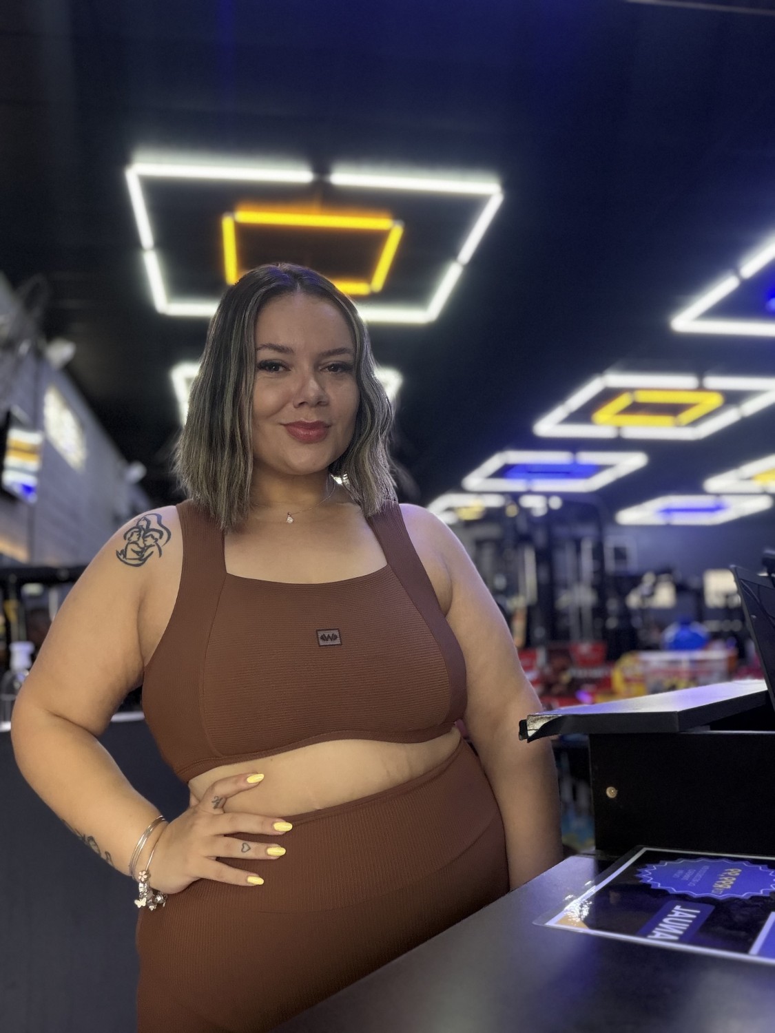 Tamanho: A modelo slim veste P e a modelo Plus veste XG