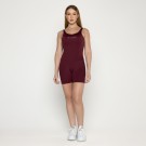 , valorizando suas curvas com elegância. O comprimento meia coxa e os logos minimalistas tornam este macacão uma escolha versátil, ideal para usar dentro e fora da academia.