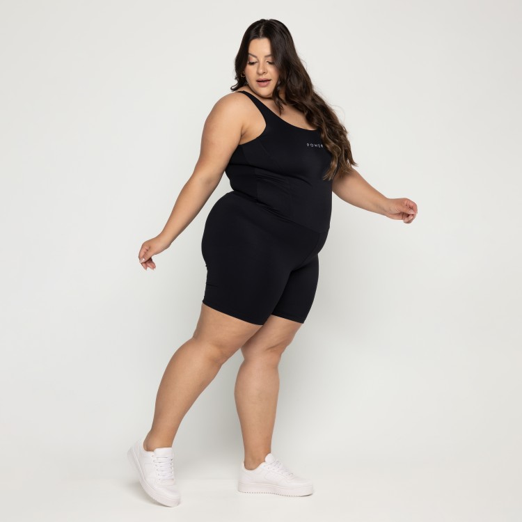, valorizando suas curvas com elegância. O comprimento meia coxa e os logos minimalistas tornam este macacão uma escolha versátil, ideal para usar dentro e fora da academia.